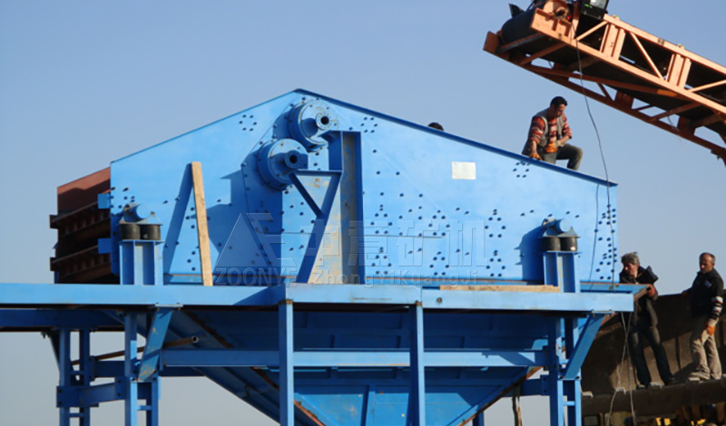 當(dāng)縱向安裝在篩體上的兩臺振動電機(jī)做相對運(yùn)轉(zhuǎn)時(shí),兩臺振動電機(jī)兩端的偏心塊便產(chǎn)生額定激振力,其產(chǎn)生在橫向的激振力由于電機(jī)的相對運(yùn)轉(zhuǎn)而相互抵消,其縱向激振力通過傳振體傳遞到整個(gè)篩箱上,而使篩面振動,從而使篩面上的物料受其激振力而在篩網(wǎng)面上向出料品方向跳躍運(yùn)動,小于篩孔的物料通過篩孔而落到下層,經(jīng)連續(xù)跳躍后從出料口流出,由于篩分過程合理,物料經(jīng)振動篩分級后,可取得幾種不同粒度的物料,完成物料的分級作業(yè)。