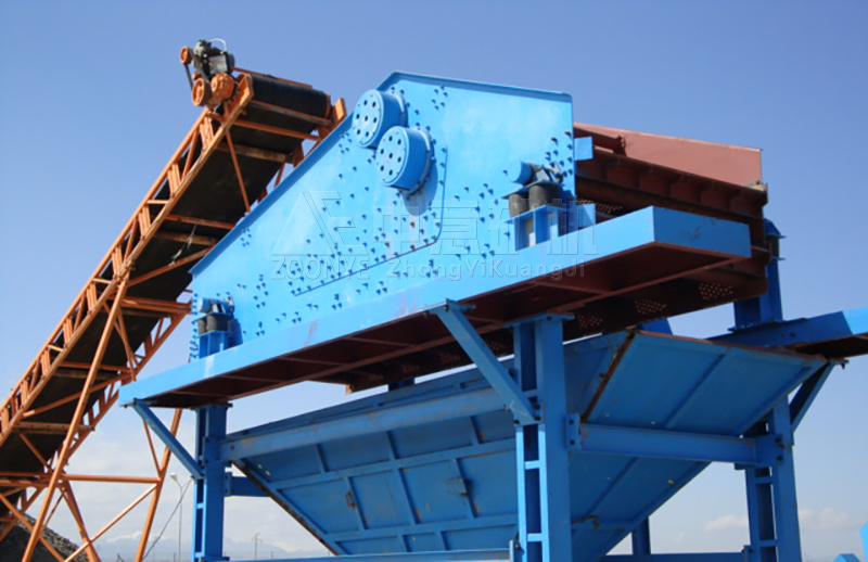 當(dāng)縱向安裝在篩體上的兩臺振動電機(jī)做相對運(yùn)轉(zhuǎn)時(shí),兩臺振動電機(jī)兩端的偏心塊便產(chǎn)生額定激振力,其產(chǎn)生在橫向的激振力由于電機(jī)的相對運(yùn)轉(zhuǎn)而相互抵消,其縱向激振力通過傳振體傳遞到整個(gè)篩箱上,而使篩面振動,從而使篩面上的物料受其激振力而在篩網(wǎng)面上向出料品方向跳躍運(yùn)動,小于篩孔的物料通過篩孔而落到下層,經(jīng)連續(xù)跳躍后從出料口流出,由于篩分過程合理,物料經(jīng)振動篩分級后,可取得幾種不同粒度的物料,完成物料的分級作業(yè)。