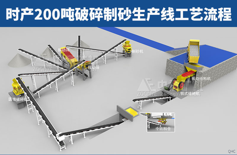 振動(dòng)給料機(jī)把石料均勻的送入到顎式破碎機(jī),顎破進(jìn)行初道破碎也就是粗破,從顎破出來(lái)的石料再通過(guò)皮帶機(jī)輸送至反擊破或圓錐破進(jìn)行二級(jí)破碎,也就是細(xì)碎制砂